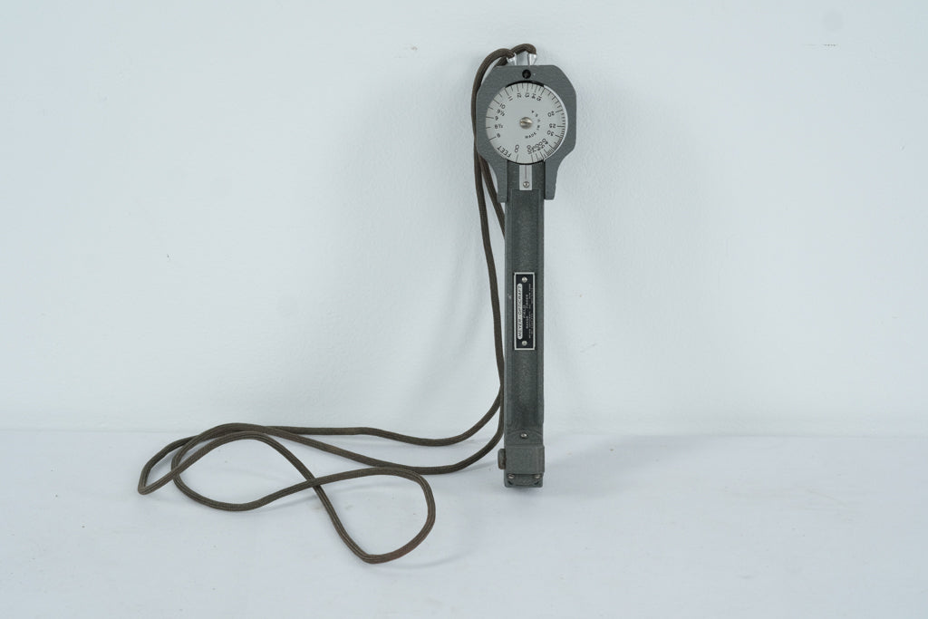 The instrument features a rugged gray metal body, a clear dial marked in feet, and the manufacturer’s plate reading: