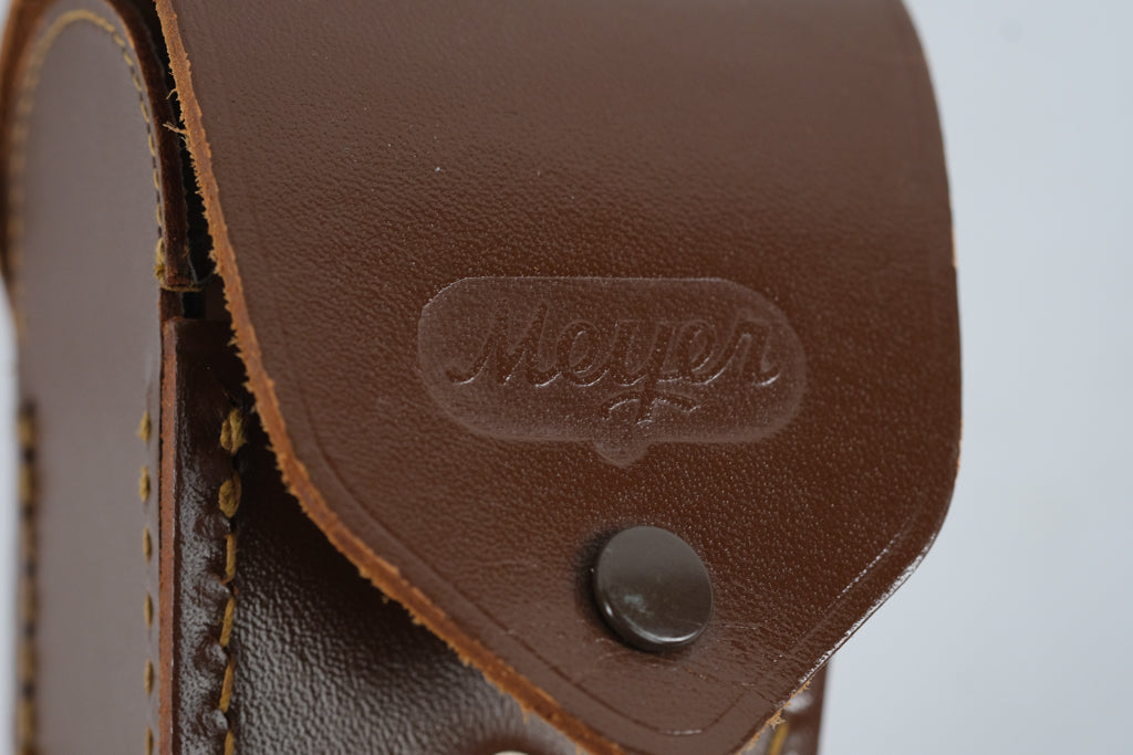 Its paired brown leather case, embossed with Meyer, is made from top grain genuine cowhide and stitched with durable yellow thread. With a belt loop for easy carrying, the case is as collectible as the range finder itself.
