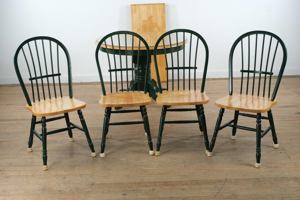 Crafted from solid wood throughout, this set showcases enduring quality and traditional craftsmanship. The table includes a removable 18" leaf for easy expansion and a custom glass top to protect the wood surface while enhancing its natural grain. Four coordinating spindle-back chairs feature sculpted seats, turned legs, and a durable painted finish for long-lasting charm.