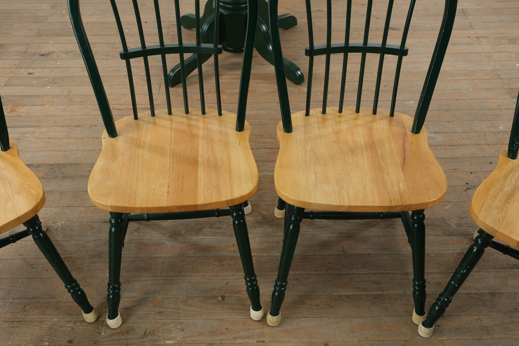 Charming and versatile, this solid wood two-tone dining set offers a perfect blend of farmhouse warmth and casual elegance. The round table features a natural wood top paired with deep forest green legs and chair backs, creating a timeless country-style look ideal for both everyday dining and cozy gatherings.