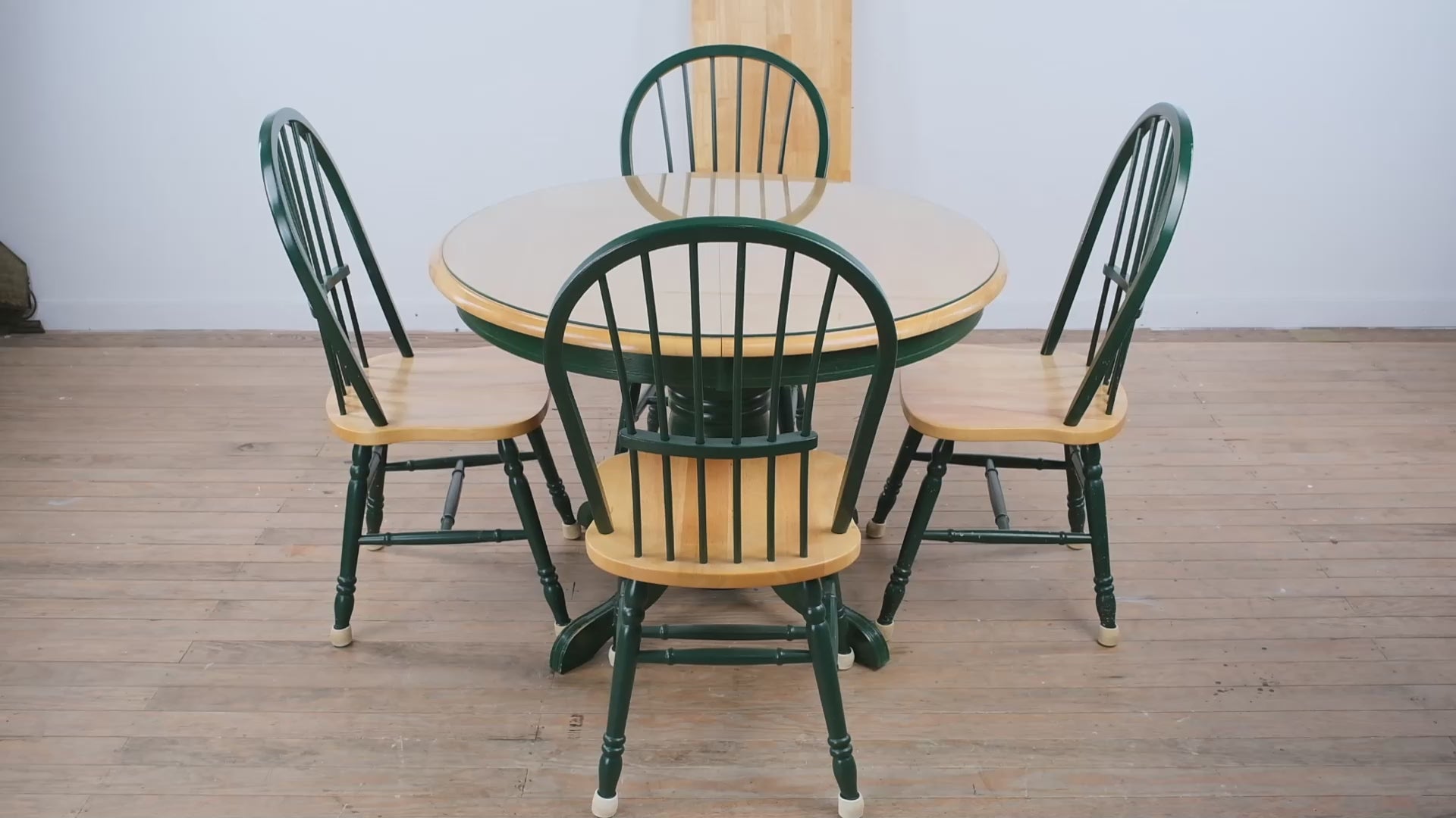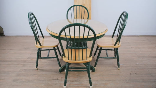 This inviting dining set captures the spirit of classic cottage and country décor, offering a fresh yet familiar aesthetic. The natural wood top contrasts beautifully with the green-painted base, creating a warm and relaxed atmosphere. Ideal for kitchen nooks, family dining areas, or small open-concept spaces, it combines practicality with timeless appeal.