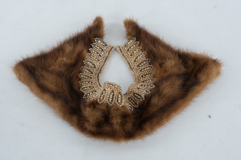 Elevate any ensemble with this exquisite vintage 1950s mink fur collar, a glamorous accessory that embodies mid-century luxury and craftsmanship. This piece features lustrous brown mink fur paired with a satin-lined interior and meticulously hand-beaded detailing — creating a statement look that’s both timeless and sophisticated.