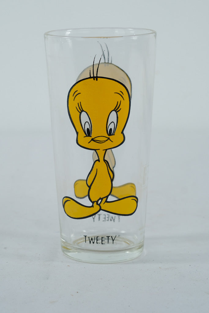 Brighten your collection with this 1973 Tweety Bird glass, a vintage Warner Bros. release featuring the beloved Looney Tunes character in bold yellow with crisp black outlines. This charming piece captures Tweety’s wide-eyed innocence and playful personality, making it a nostalgic treasure for Looney Tunes collectors and retro glassware enthusiasts alike.
