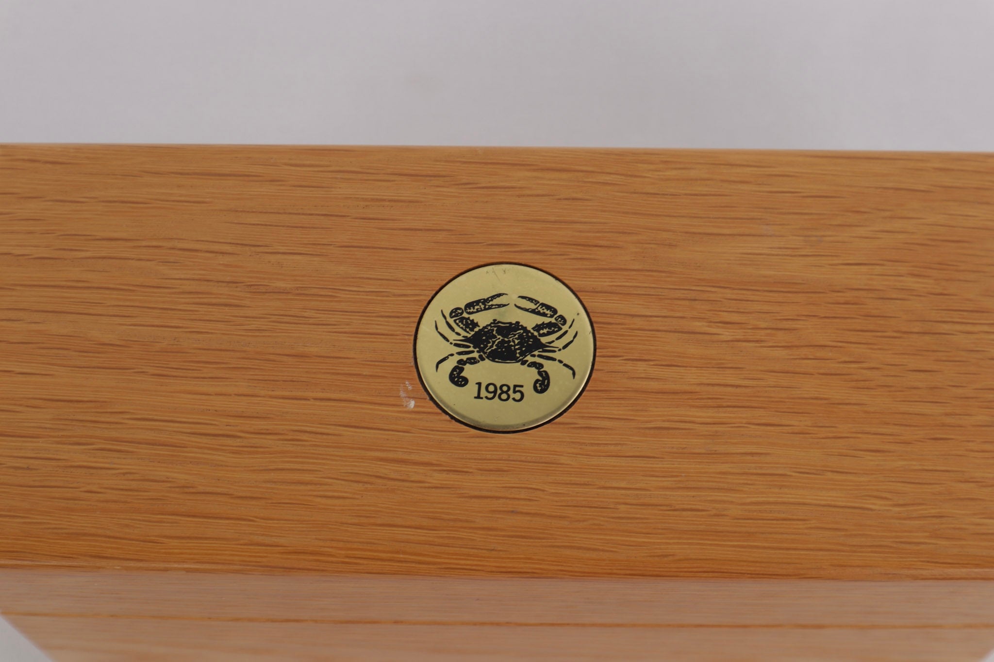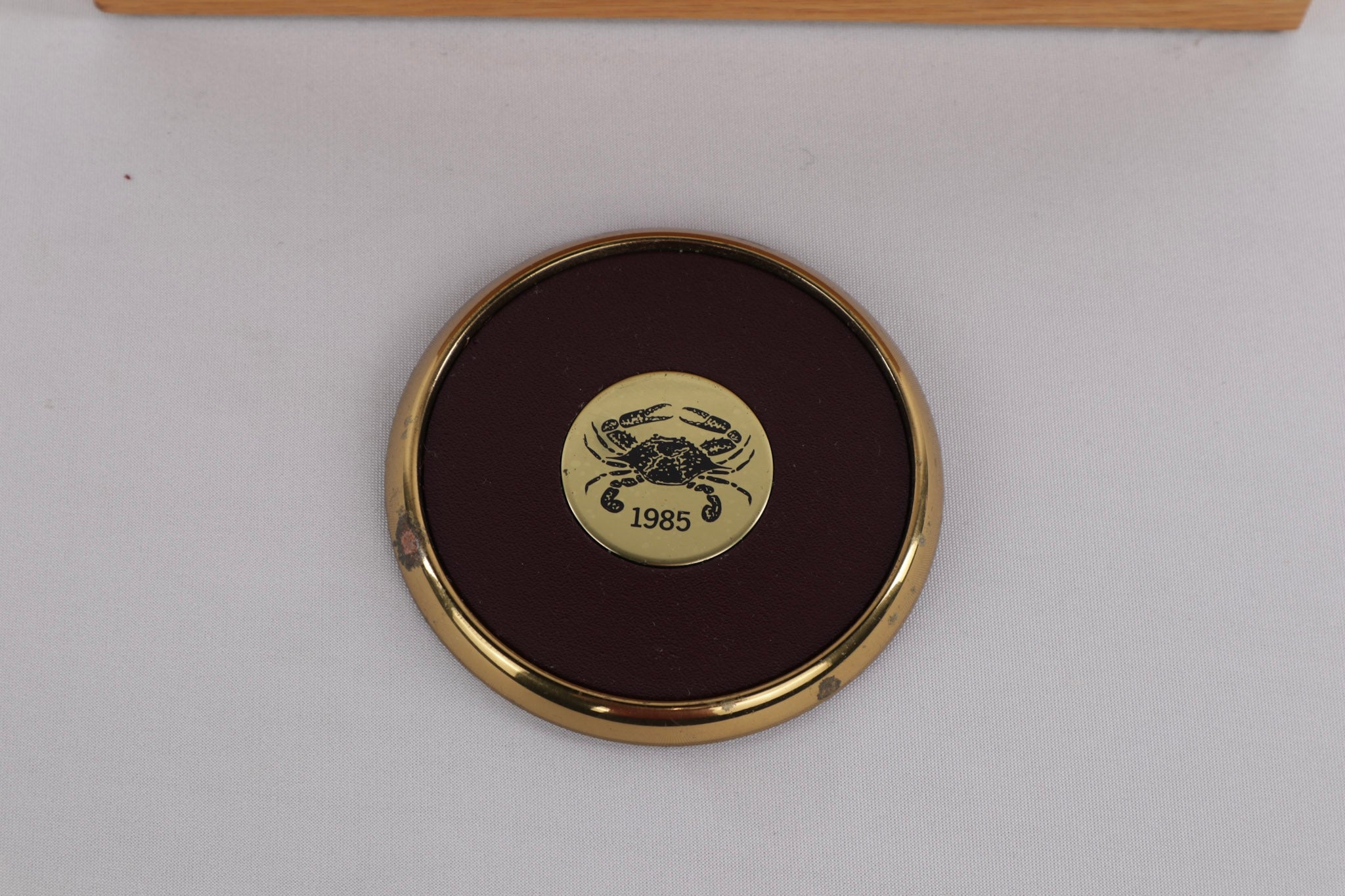 Add a touch of nautical charm and vintage style to your home with this set of six brass-trimmed coasters, each featuring a gold medallion with a crab motif dated 1985. Housed in a sturdy oak wooden box with a matching crab emblem on the lid, this set is both practical and collectible.