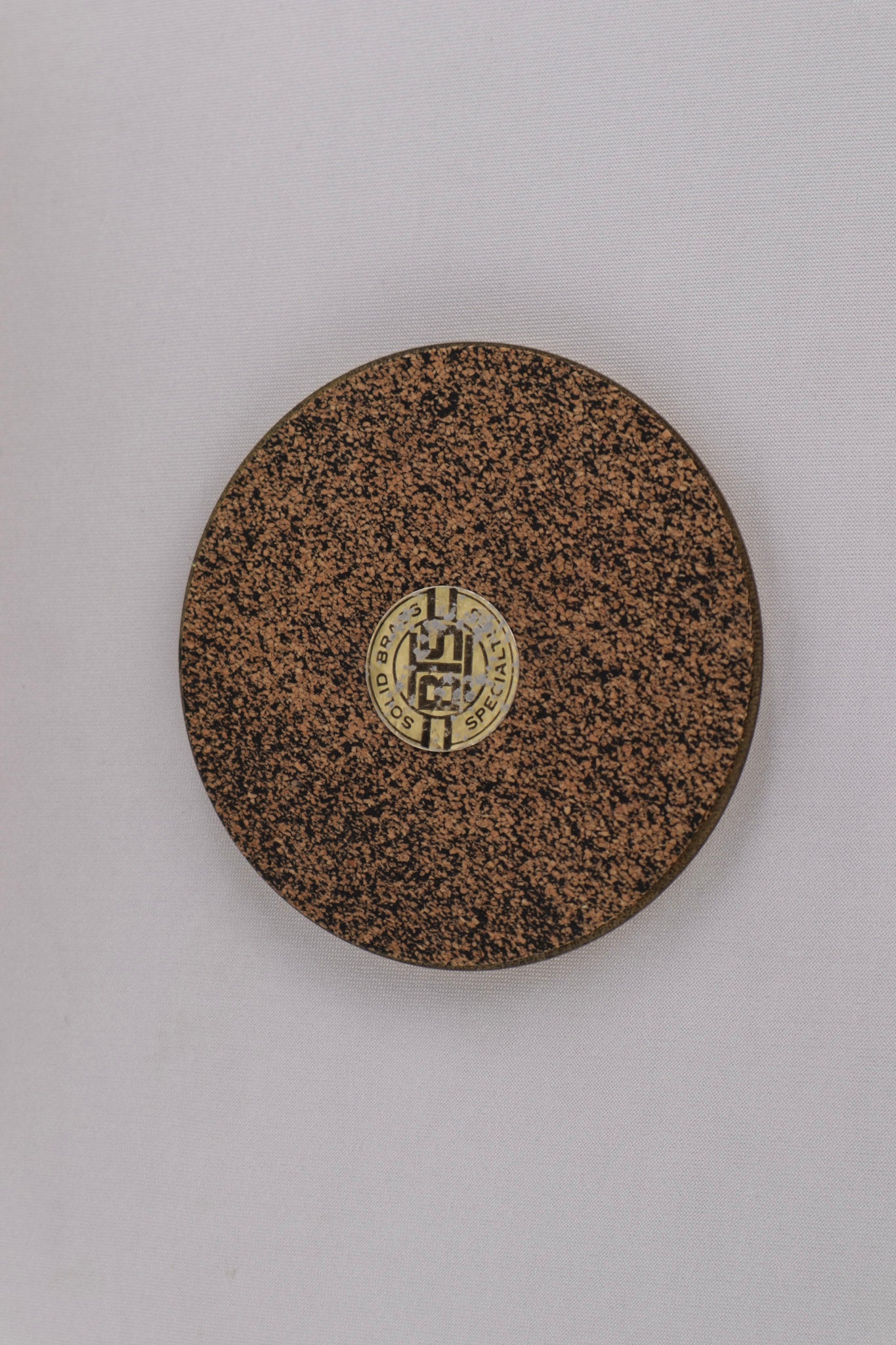 Design: Brass trim, enamel top, crab emblem medallion, cork base