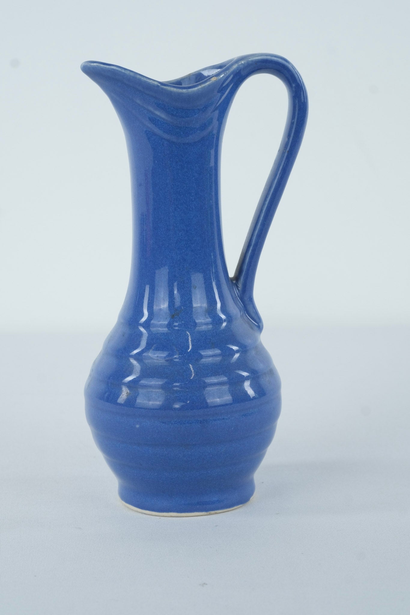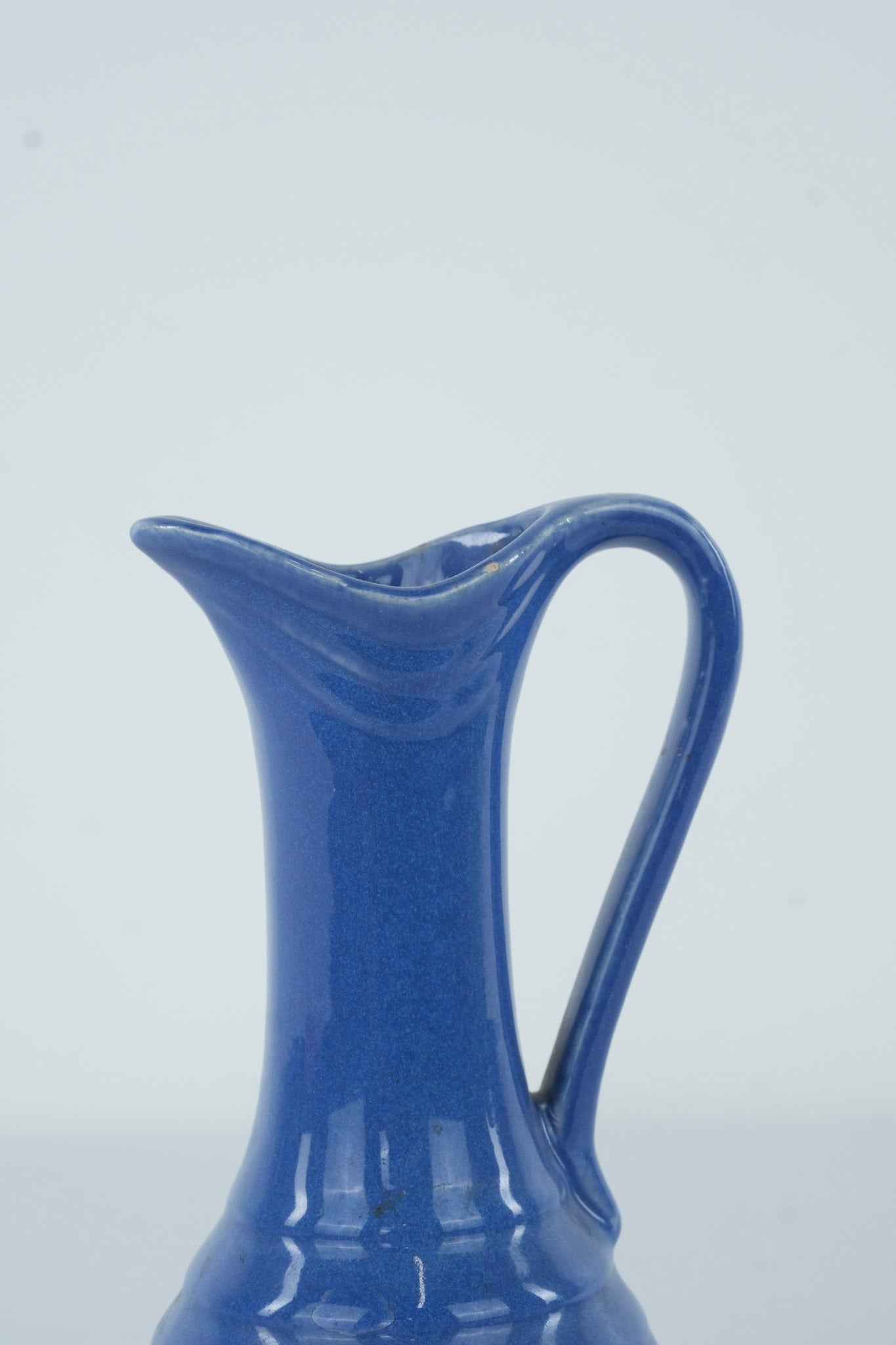 Elegant vintage ceramic ewer-style pitcher vase in a rich cobalt blue glaze. The tall, narrow neck, flared spout, and single handle give it a timeless silhouette, perfect for displaying as a decorative piece or for use as a bud vase.