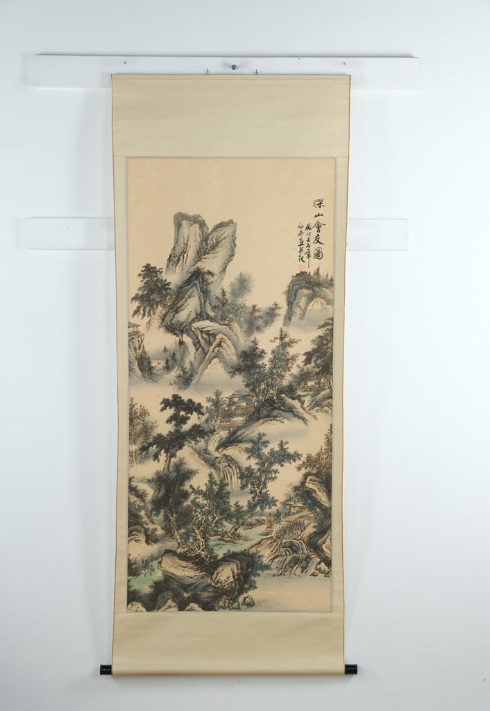 Vintage Chinese Hanging Scroll Landscape Painting – Waterfall & Mountain Scene, 26"x66"