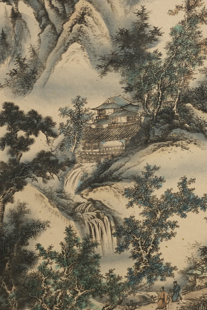 • Design: Mountain landscape with waterfalls, pines, and scholars