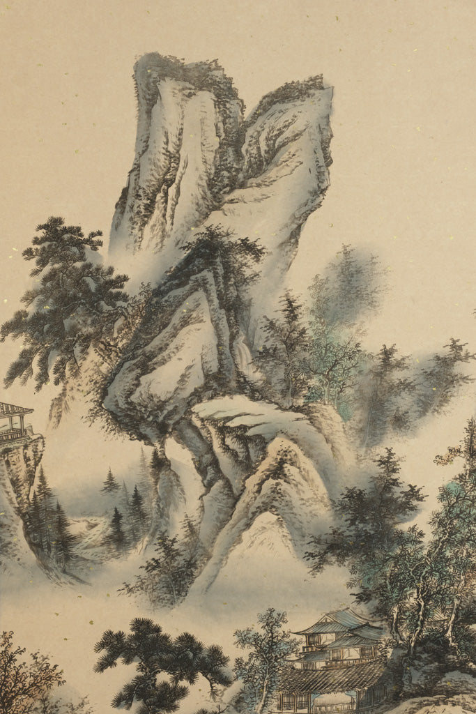 Capture timeless serenity with this vintage Chinese hanging scroll landscape painting, a stunning depiction of misty mountains, flowing waterfalls, and tranquil village life. Executed in traditional ink and watercolor on paper, this hand-painted scroll features intricate brushwork and fine detail—inviting the viewer into a poetic world of nature and harmony. The artist’s inscription and red seal mark add authenticity and artistry, while the elegant silk brocade mounting complements the refined aesthetic.