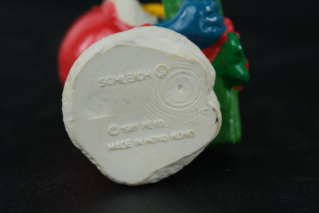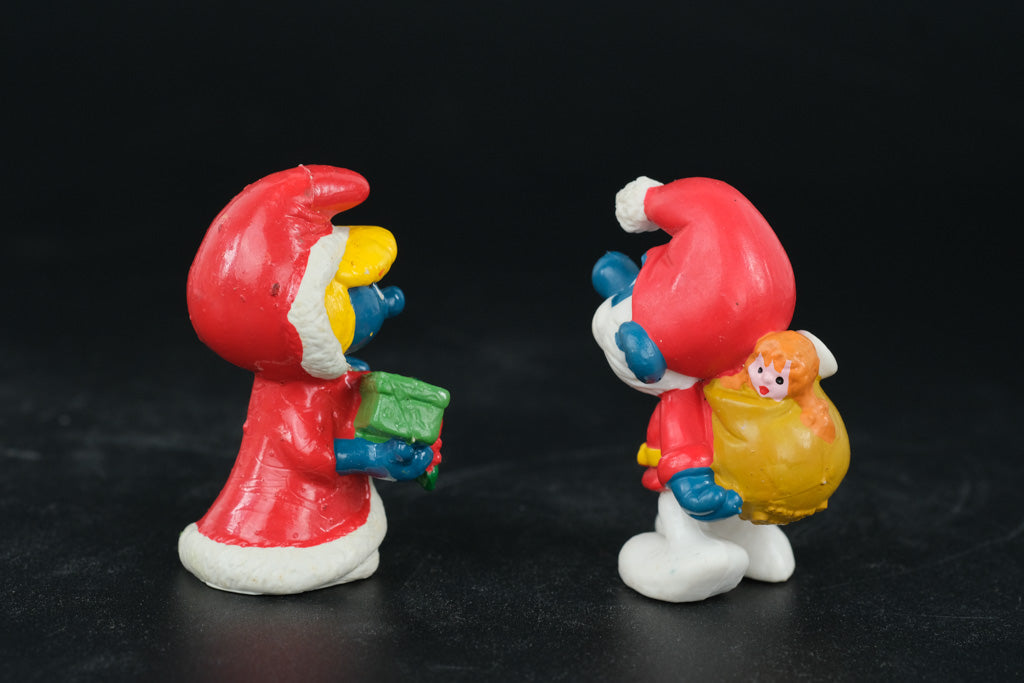 Charming vintage Christmas Smurfs figurine pair by Schleich, marked ©1984 and ©1987 Peyo. These collectible PVC figures feature Santa Smurf carrying a sack of toys and Smurfette in a festive hooded coat holding a wrapped gift. Perfect for Smurfs fans, holiday displays, or collectors of classic 1980s toys.