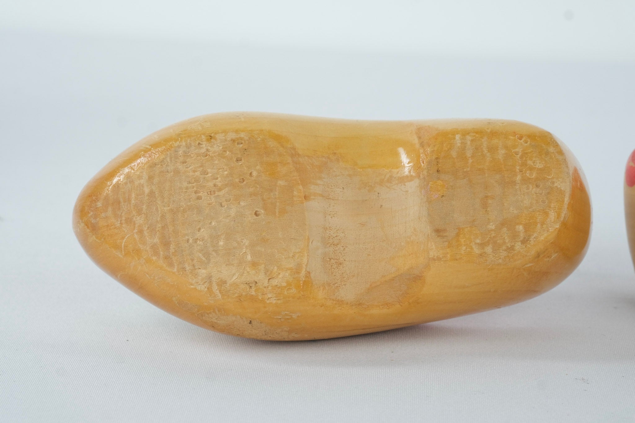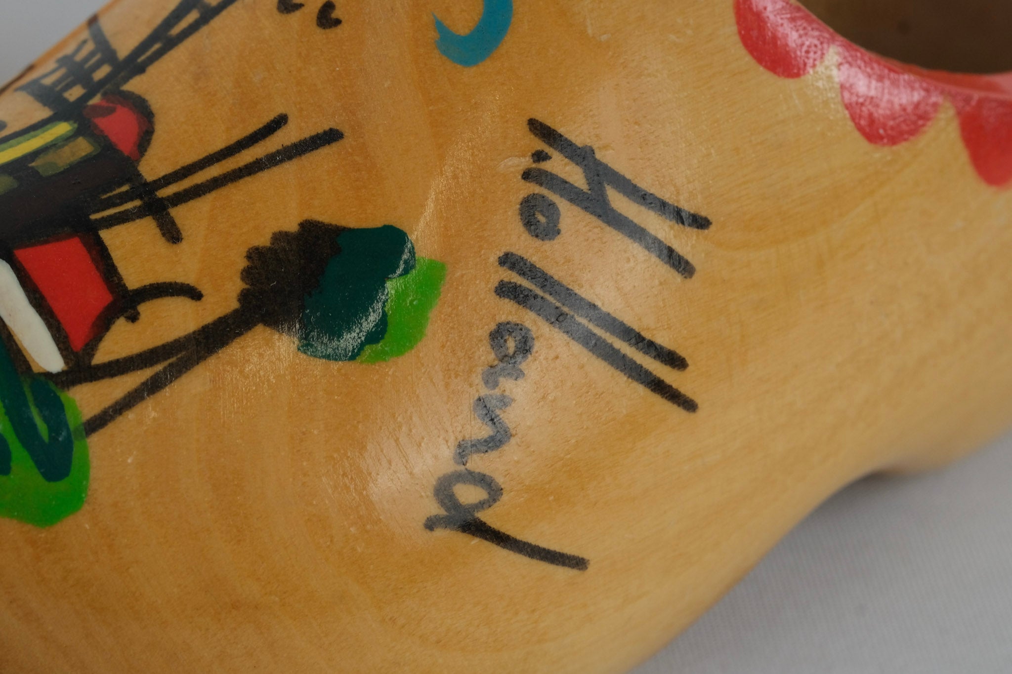 This charming pair of vintage Dutch wooden clogs features traditional hand-painted designs of a windmill and countryside scene, accented with bright red trim. Marked “Holland” on the front, these clogs were likely made as mid-20th century tourist souvenirs. Larger than miniature decorative clogs, these are a substantial pair that can be displayed as folk art, rustic décor, or a cultural collectible.