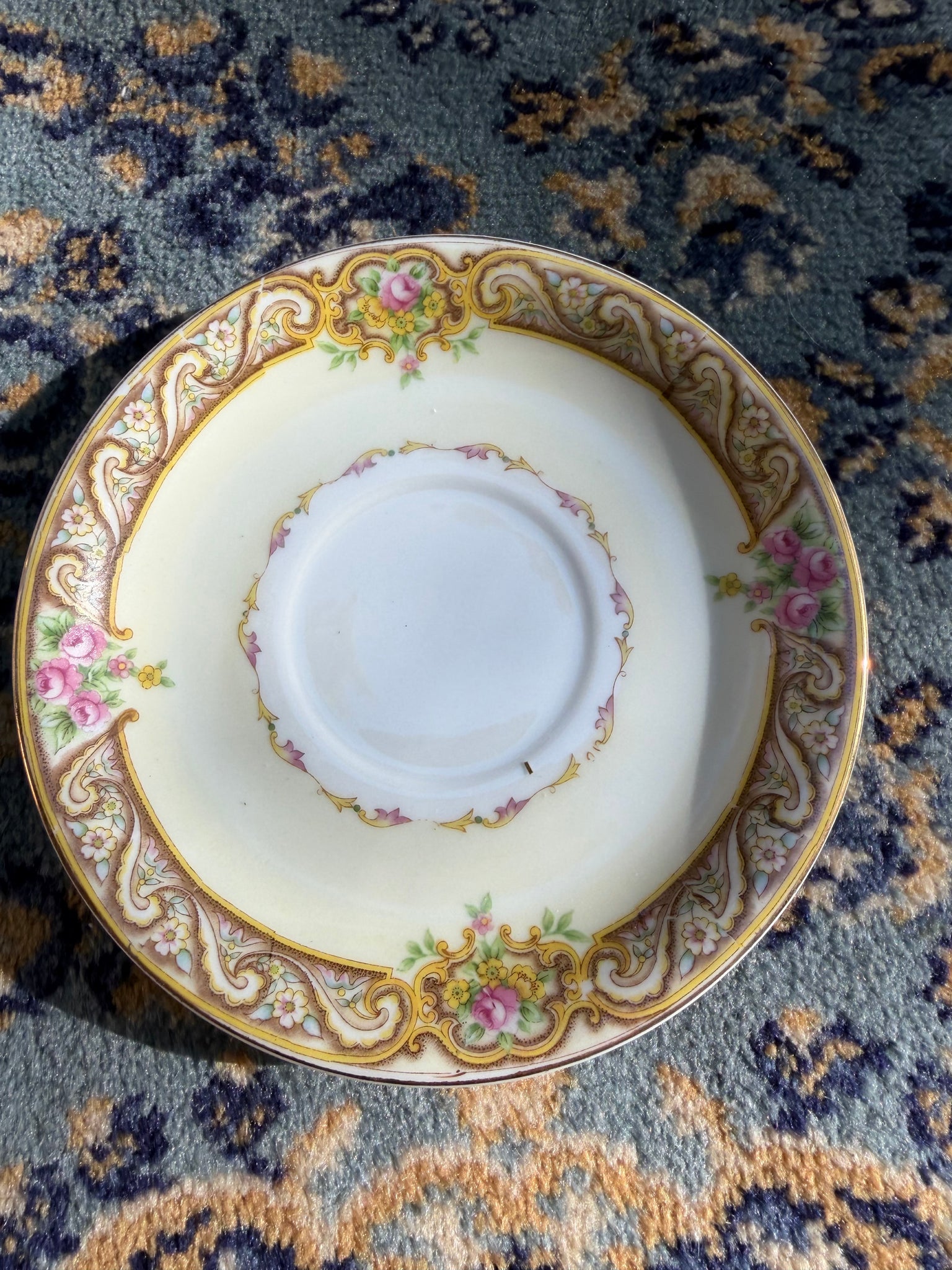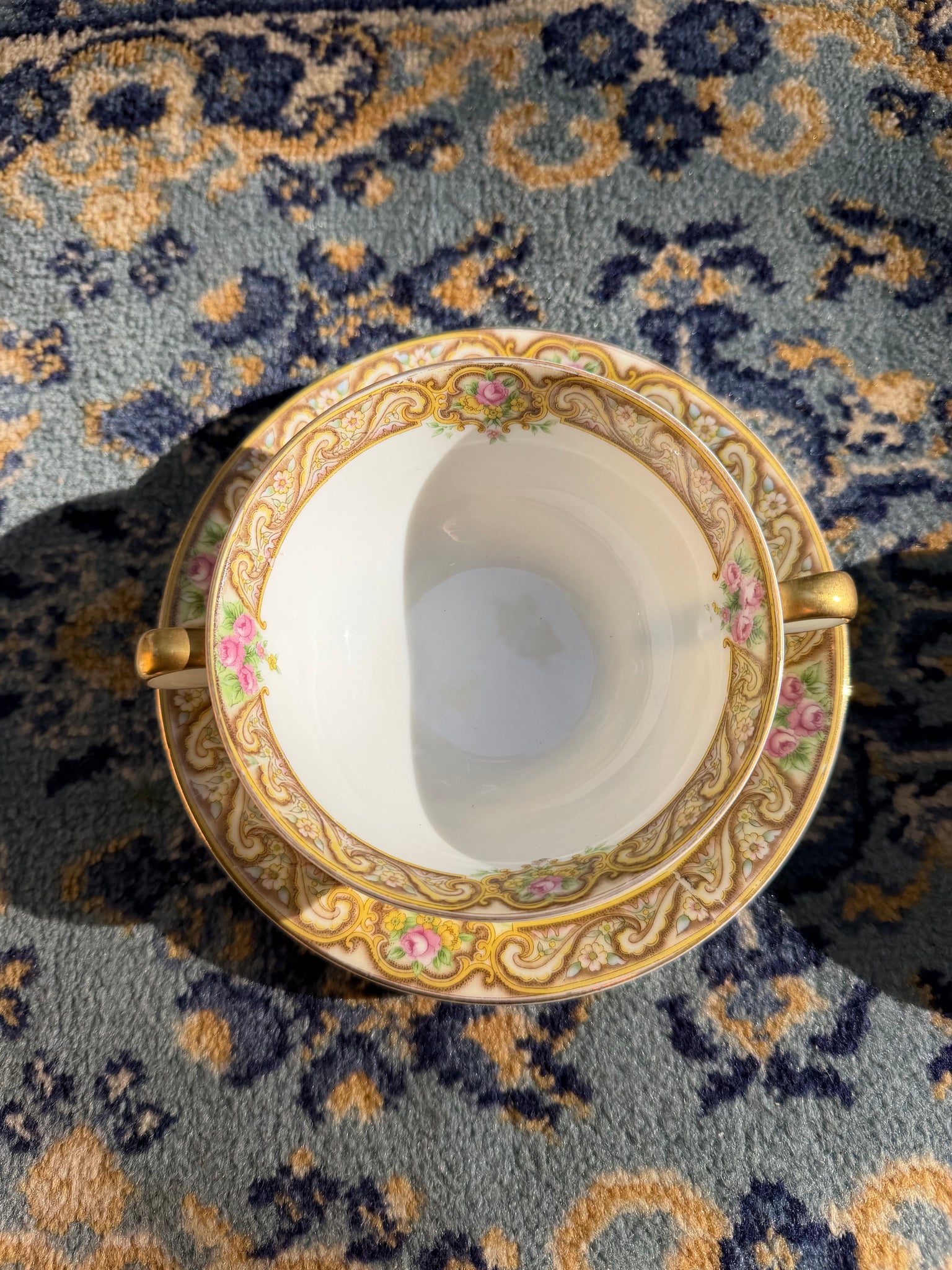 Elegant and timeless, this set of two Empress China Japan soup cups with matching saucers showcases refined artistry and old-world charm. Each cup features dual gold-trimmed handles, a delicate ivory and cream base, and an ornate border of pink roses, scrollwork, and gold filigree—a hallmark of Empress China’s mid-century Japanese porcelain craftsmanship.