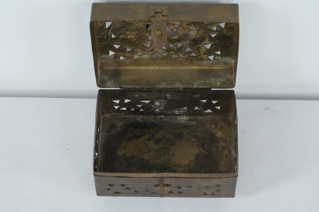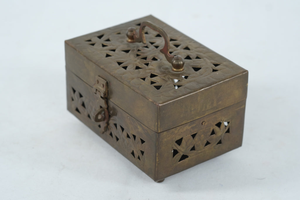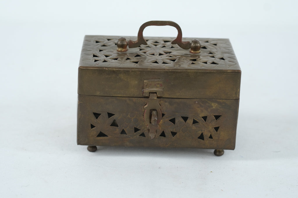 This vintage brass trinket box combines decorative appeal with old-world charm. Crafted with intricate cutout patterns on all sides and the lid, it was likely designed to allow air circulation—making it suitable as a potpourri box, incense holder, or simply as a decorative keepsake chest. The hinged lid features a sturdy handle and latch closure, while the box rests on four rounded feet, adding stability and character.