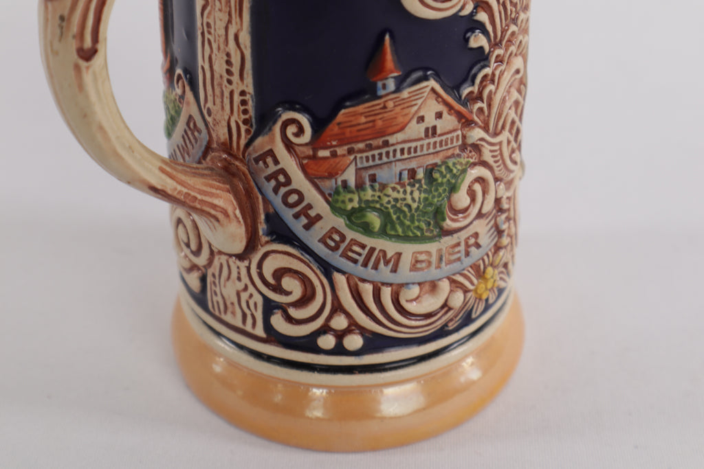 This vintage German-style beer stein captures the festive spirit of Bavarian beer culture with colorful raised relief details. One side shows a traditional tavern scene with costumed figures, while the other features German phrases such as “Froh beim Bier” (Happy with Beer) and “Das Lieben wir” (That’s what we love). The stein is topped with a decorative pewter lid, completing its authentic old-world charm.