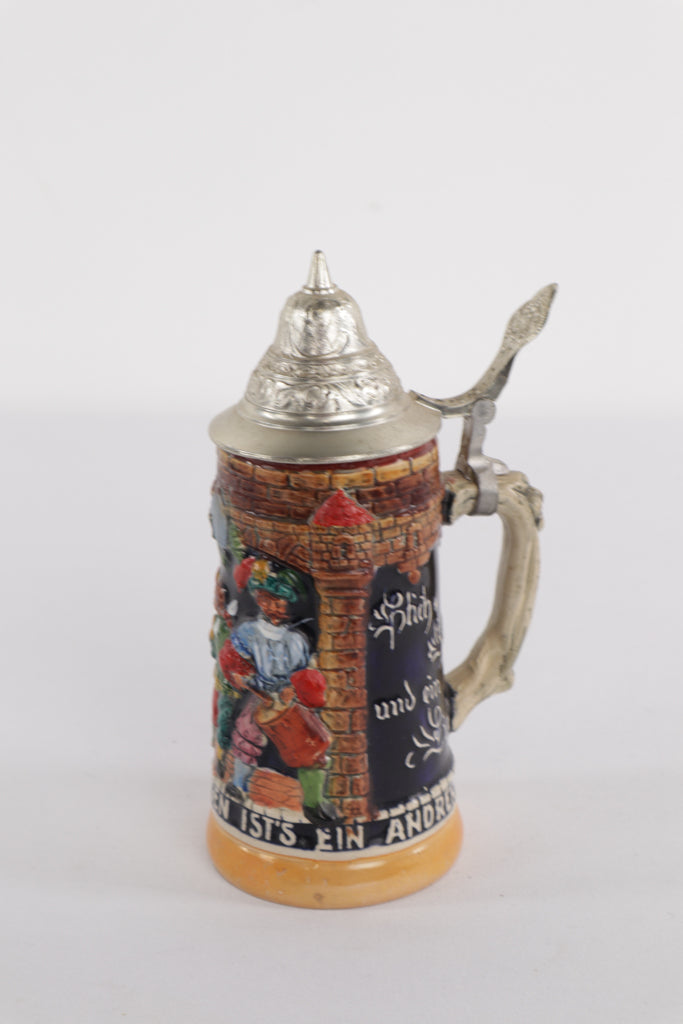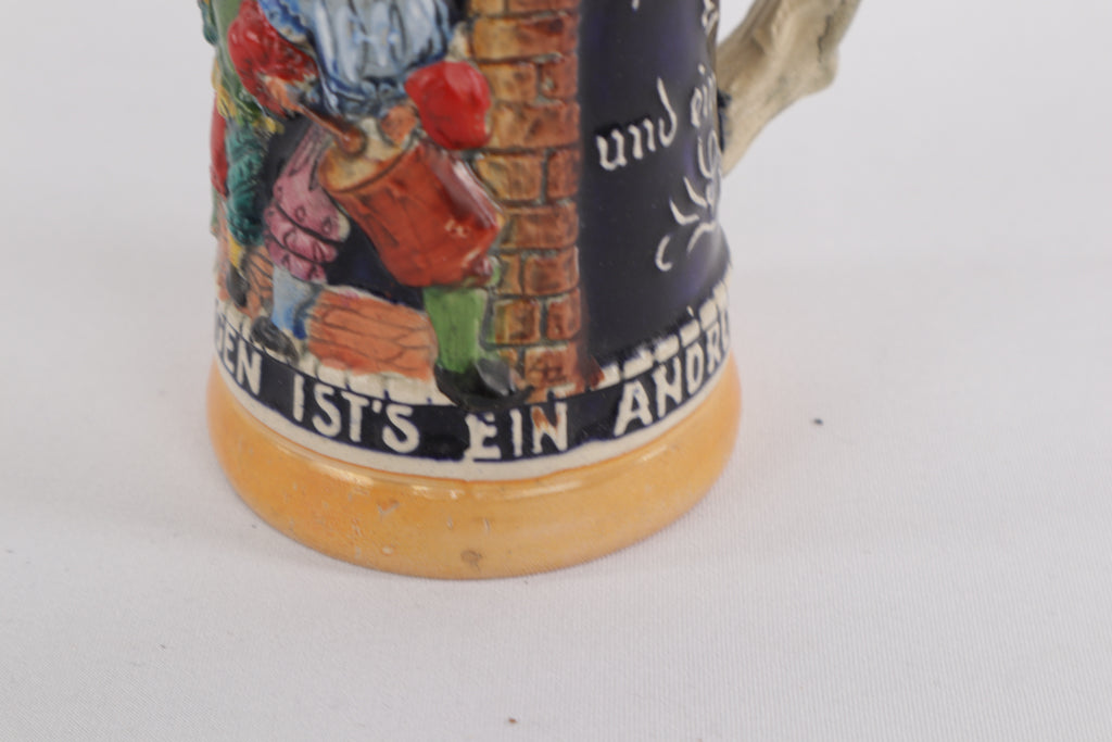 • Design: Raised relief tavern scene with German script, ornate handle and rim decoration