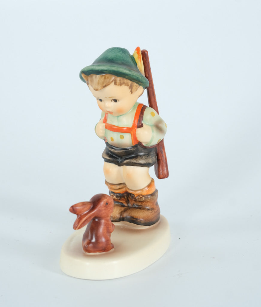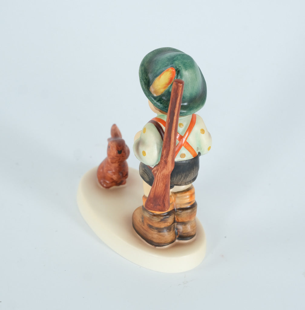 The piece depicts a young Bavarian boy dressed in lederhosen, green hat, and boots, carrying a hunting rifle slung across his back. He gazes tenderly down at a small rabbit sitting at his feet — a charming scene that reflects the gentle humor and warmth of Hummel artistry.