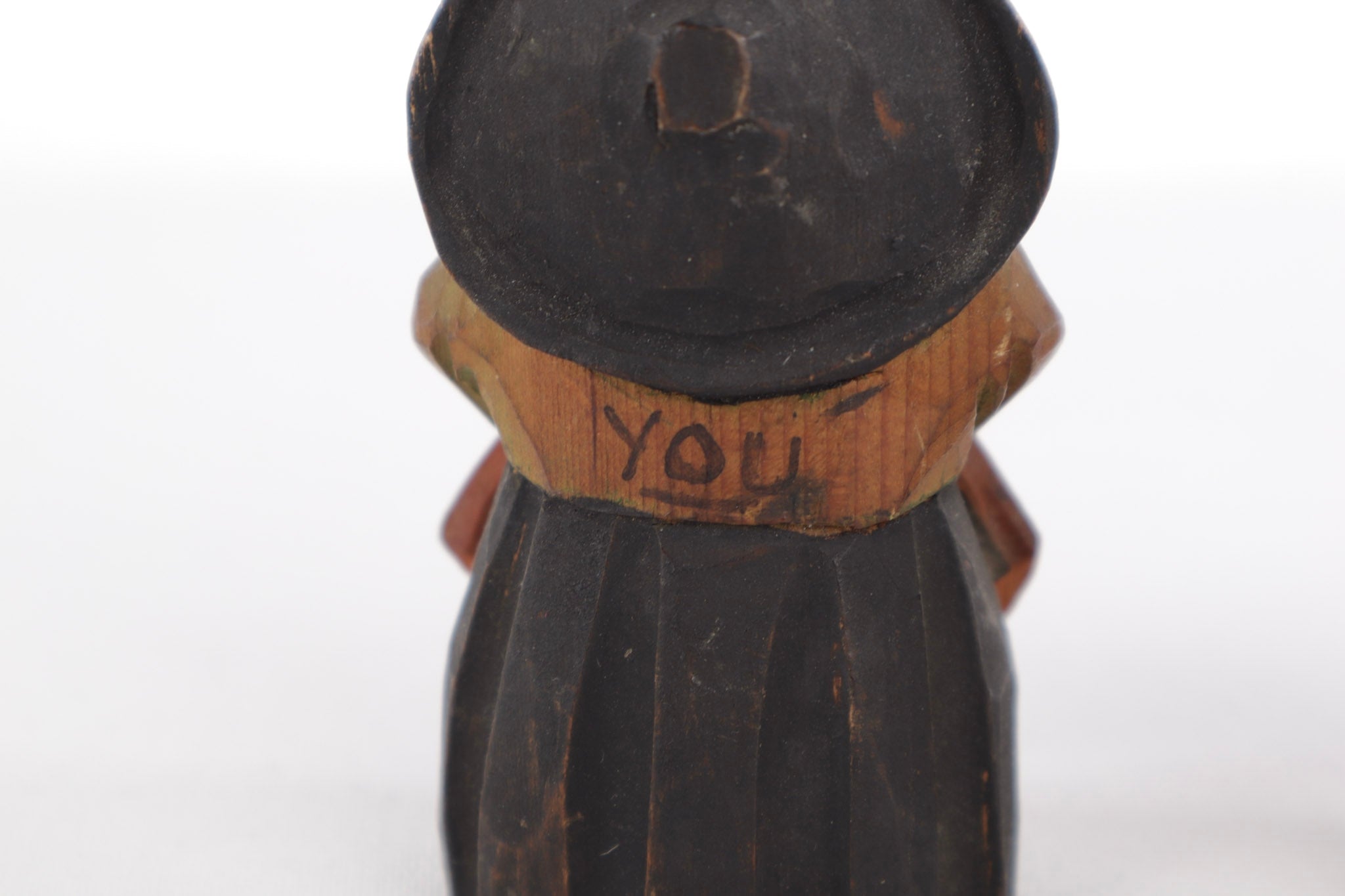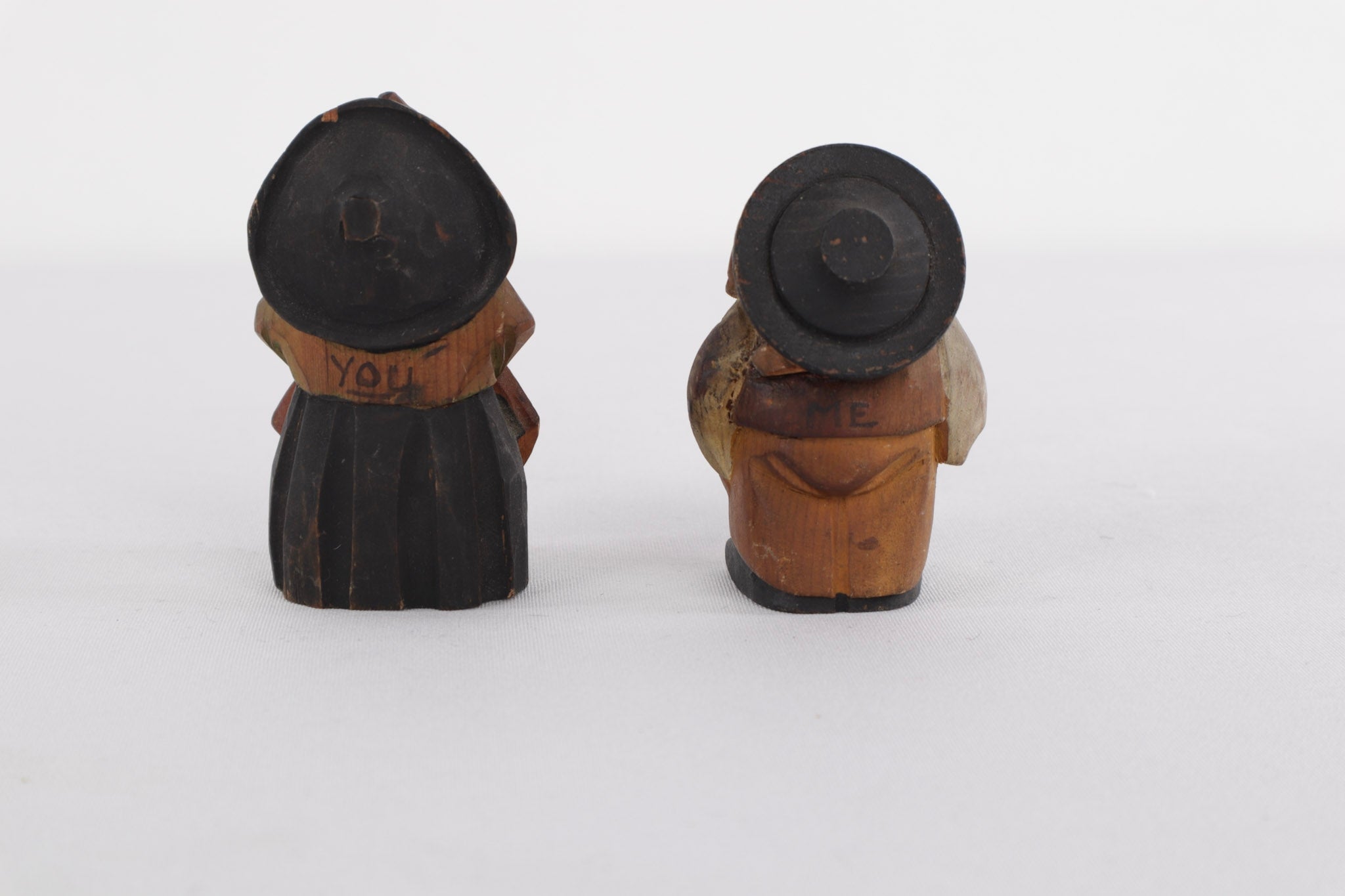 This delightful pair of vintage hand-carved wooden figures features a man and woman with wide open mouths in a humorous, laughing expression. On the back, they are labeled “ME” and “YOU,” giving them a playful, folk art charm. These figures were likely made as novelty collectibles or souvenirs, showcasing rustic craftsmanship with simple painted details. They make a fun addition to a folk art or whimsical carving collection.
