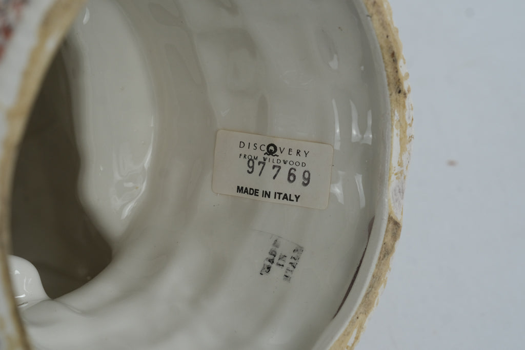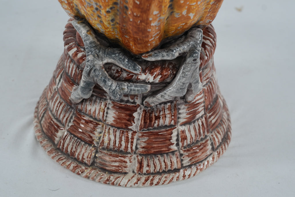 A striking example of Italian craftsmanship, this hand-painted ceramic owl figurine from the Discovery by Wildwood collection blends artistry, whimsy, and bold color. Standing an impressive 15 inches tall, it features intricate detailing—layered feathers in green, yellow, and blue tones, expressive eyes framed by sculpted relief, and a textured basket-like perch.