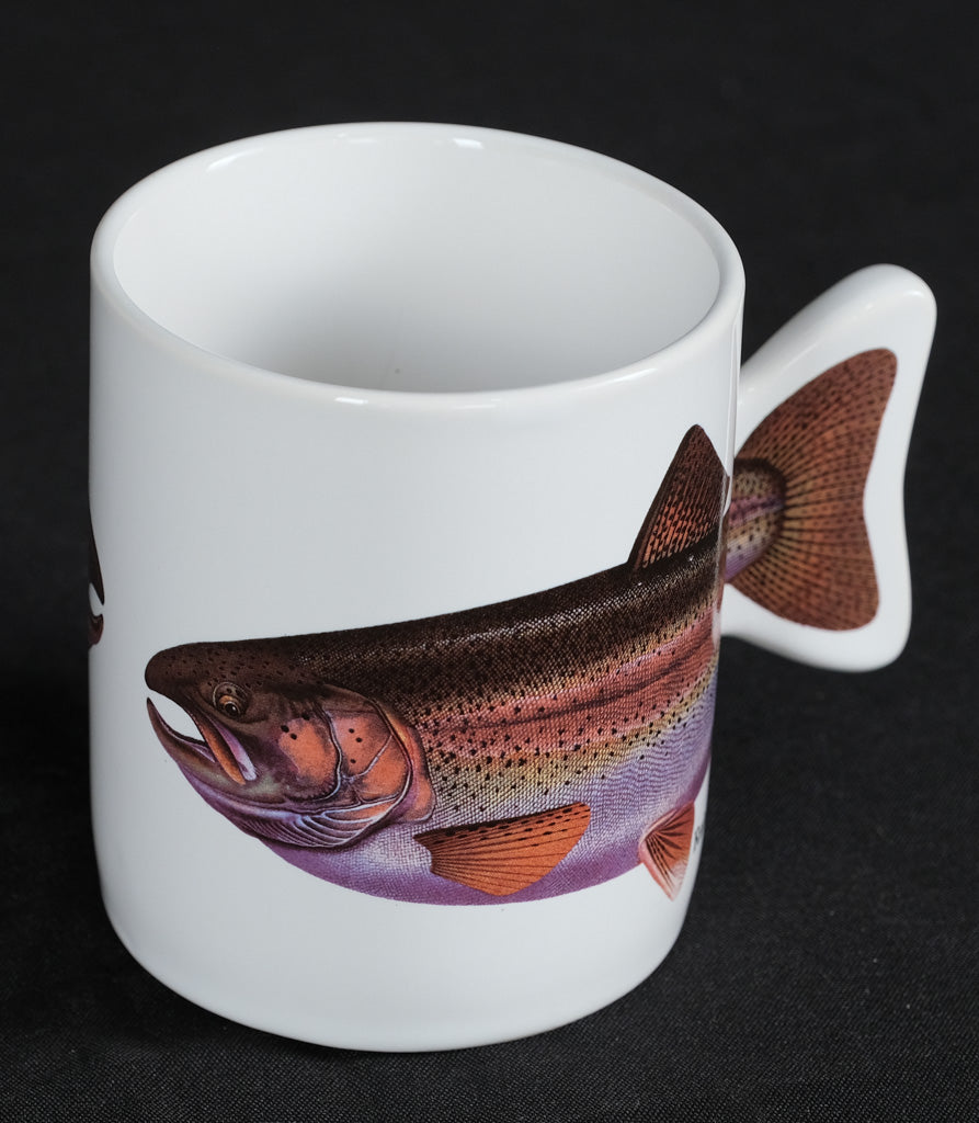 Hook a one-of-a-kind find with this vintage Rainbow Trout mug, featuring a detailed trout illustration that wraps around the mug and a 3D fish-tail handle for extra character. Produced by Salamander in 1990 and made in Taiwan, this collectible novelty mug is perfect for fishermen, outdoor lovers, and retro kitchenware collectors alike.
