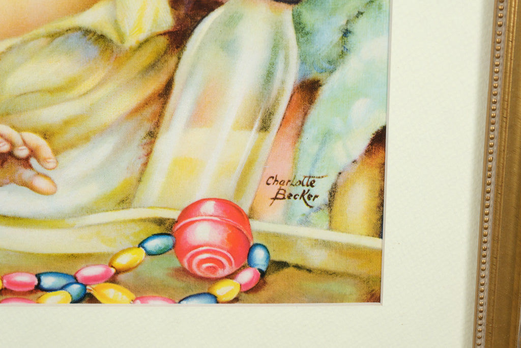 This charming vintage print by Charlotte Becker features one of her iconic, wide-eyed baby portraits, rendered in warm pastel tones with a joyful expression and playful composition. Becker was a celebrated mid-20th-century illustrator known for her sentimental and whimsical depictions of children.