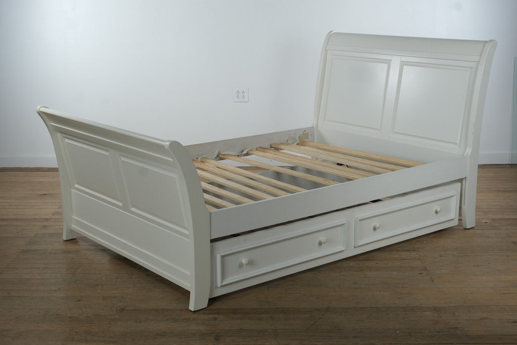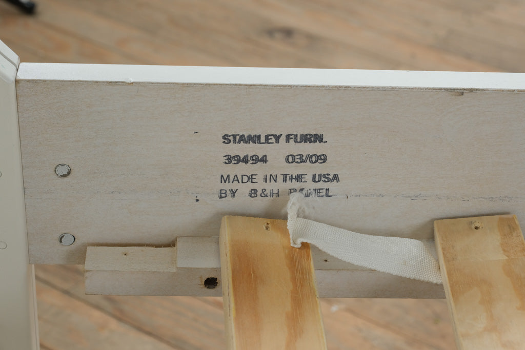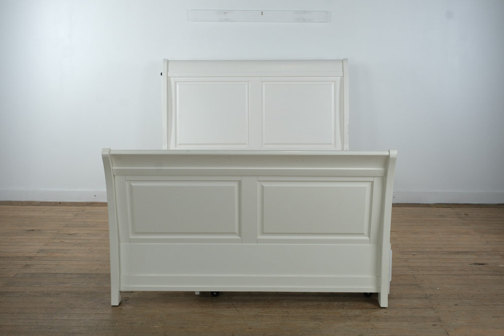 Graceful curves meet timeless craftsmanship in this beautifully designed full-size white sleigh bed by Stanley Furniture. Its classic silhouette and crisp white finish bring a touch of refined charm to any bedroom, offering both elegance and practicality through its clever pull-out trundle design.