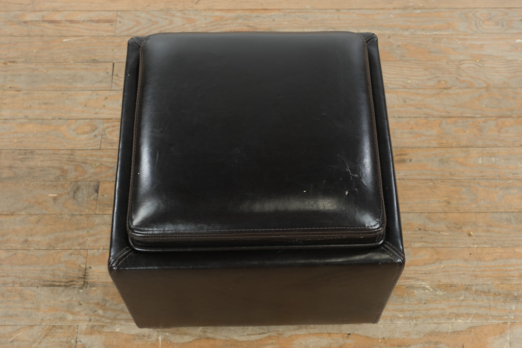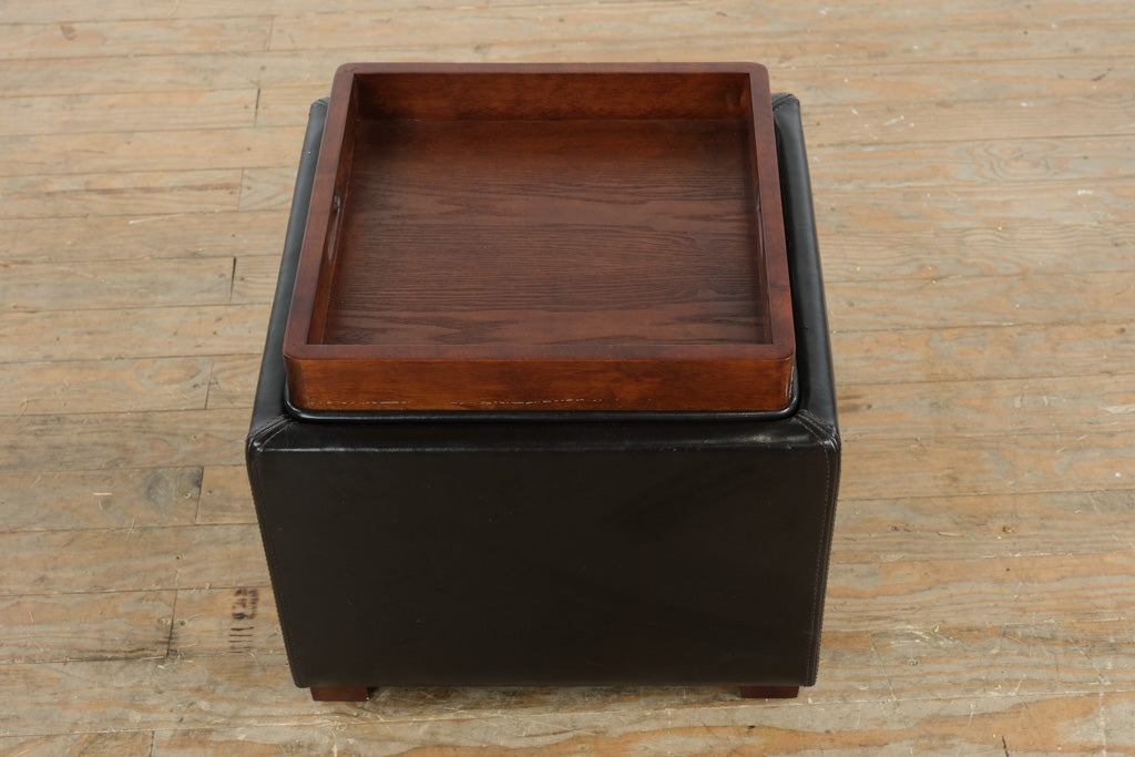 A multifunctional favorite for small spaces, this ottoman serves as extra seating, a coffee table substitute, or discreet storage for living rooms, dens, or bedrooms. Its rich contrast between black leather and wood adds a refined, contemporary edge that suits a range of décor styles.
