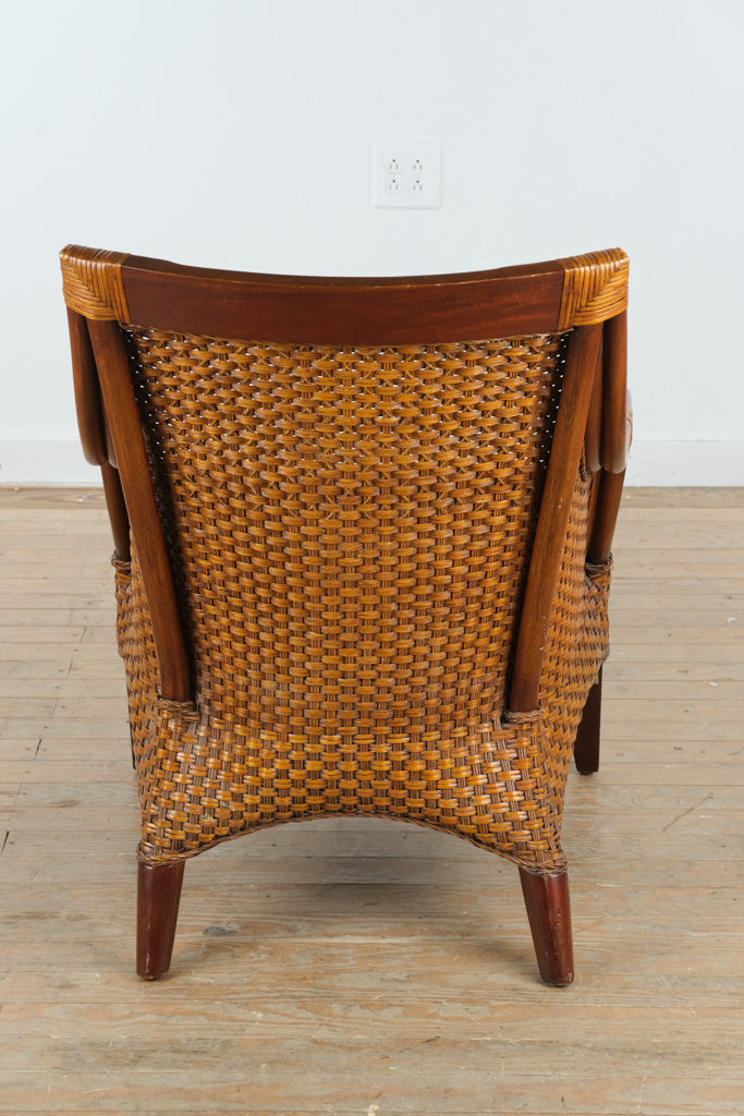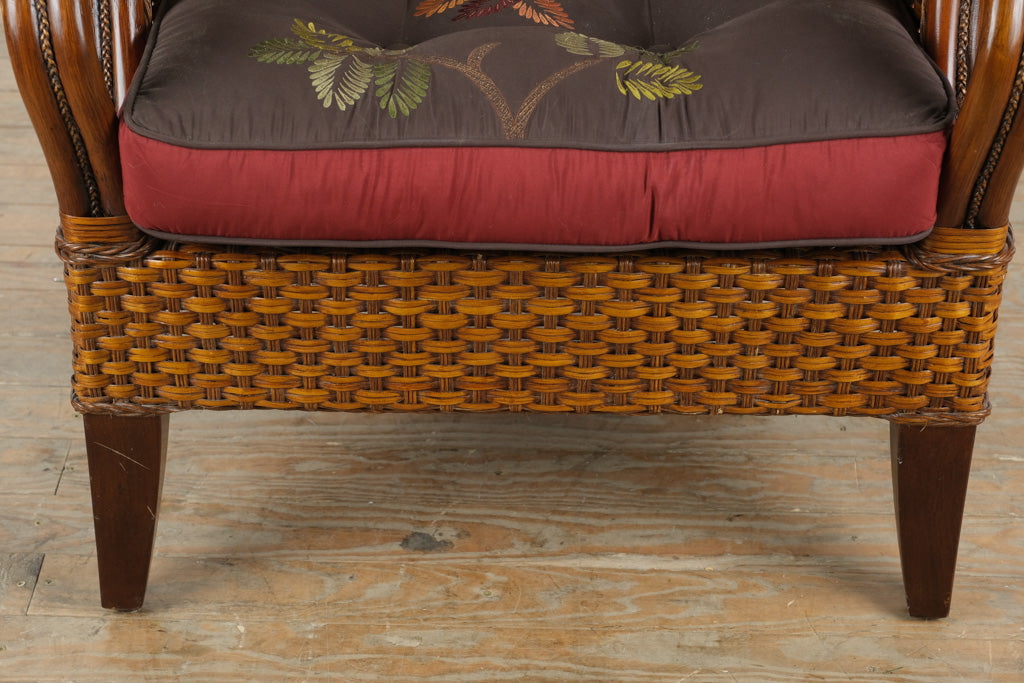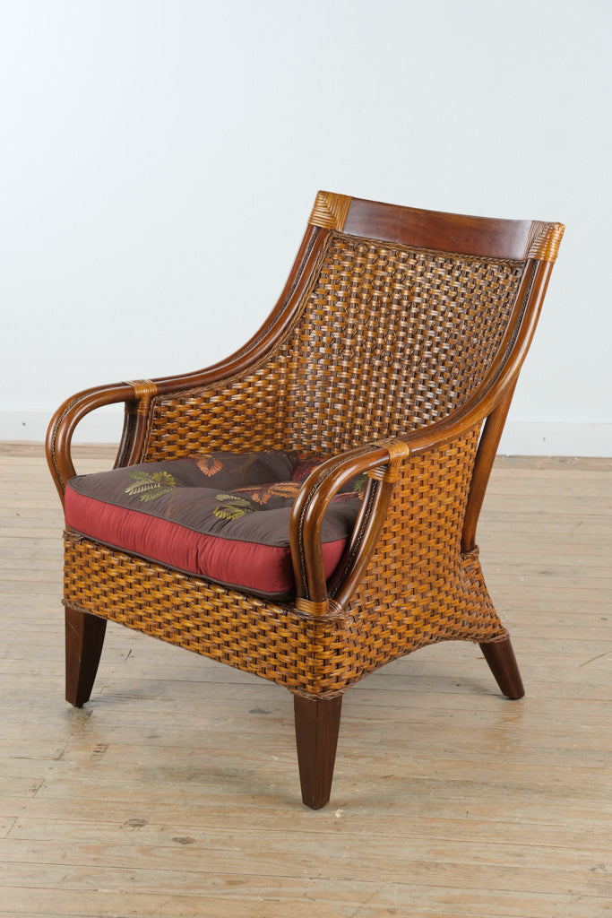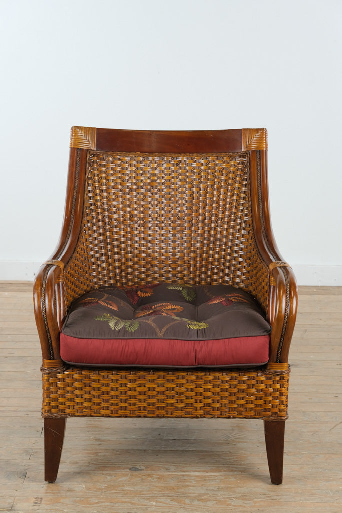 Crafted with a solid wood frame and expertly handwoven rattan, this chair reflects Pier 1’s long-standing commitment to artisanal texture and natural materials. The gently curved arms and high back provide visual softness, while the tight rattan weave adds durability and depth. The plush seat cushion, upholstered in a botanical-patterned fabric, offers both comfort and character.